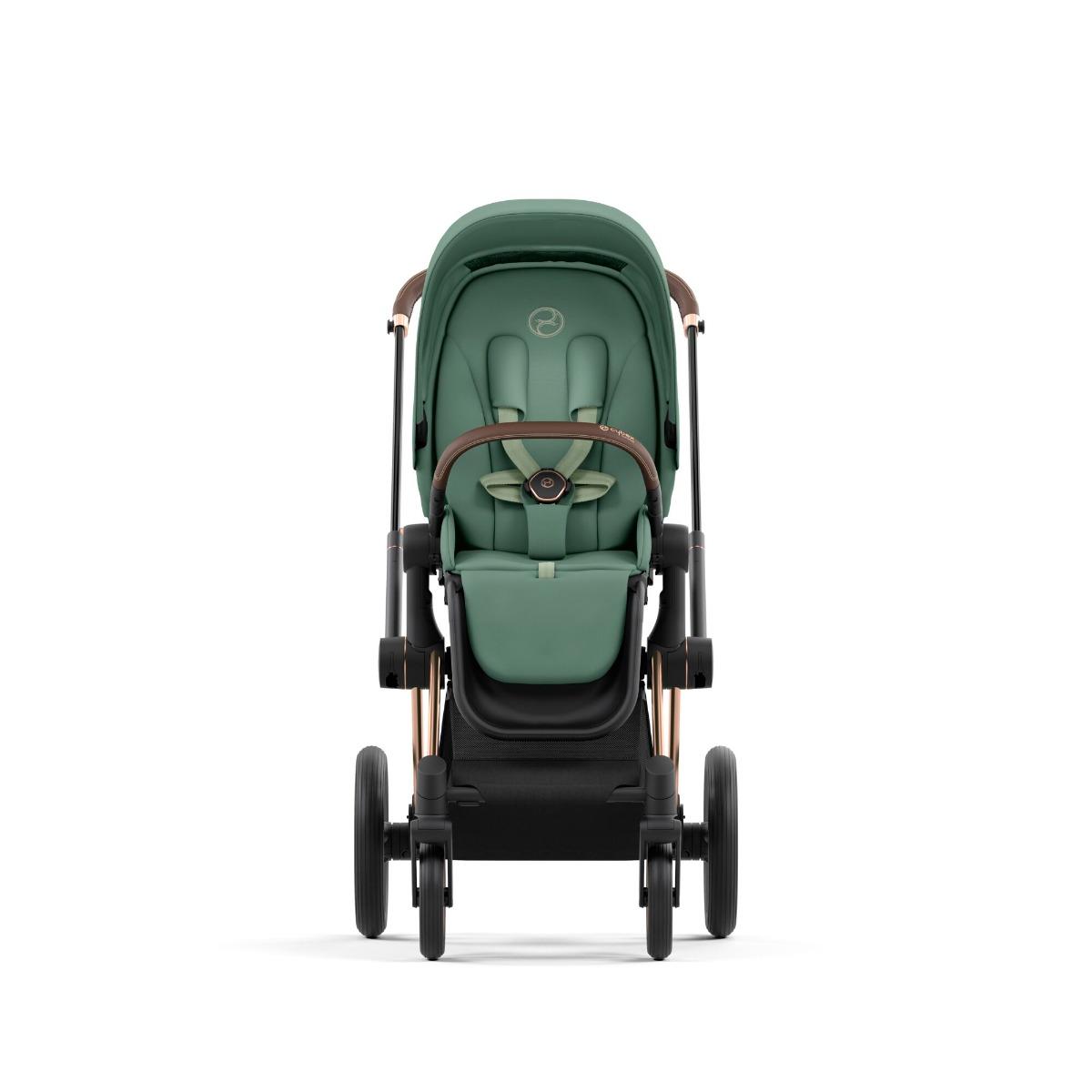 Cybex Priam 4.0 візочок у комплектації 2 в 1 Leaf Green на шасі Rose Gold – це найновіша модель візочка Cybex Priam. Візочок Cybex Priam преміум класу, призначений для дітей від народження до 4 років. Виробник врахував побажання батьків та вдосконалив візок. Коляска стала вищою, попереду люльки з’явилася зручна кишенька на блискавці, оглядове віконце в нижній частині люльки повністю на блискавках, 5-ти точкові ремені в прогулянковому блоці регулюються набагато зручніше, змінилася форма підніжки в прогулянковому блоці, також змінився каптур у прогулянковому блоці. Оновлений візочок пропонує легке, компактне шасі та фантастичний комфорт із амортизаторами на всіх колесах. Cybex Priam – одна з найкращих колясок на сьогоднішній день, продумана до дрібниць і вражає стильним дизайном, функціональністю і бездоганною німецькою якістю.